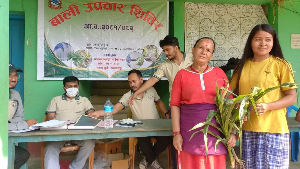 मकवानपुरगढी गाउँपालिकाको कृषि विकास शाखाद्घारा सञ्चालित बाली उपचार शिविर ।