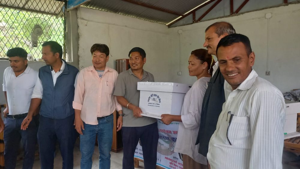 मकवानपुरगढीका कृषकलाई तालिमपछि मौरी घार वितरण गरिँदै ।